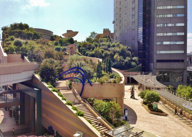 にょきっと背の高いビルの根元には、カーブを描いた建築物と、緑の樹木しげる庭園が。まるで都会のオアシスのような外観をもつこちらのスポットには、映画館やファッションモール、野外の円形劇場などの各種施設が揃っています。