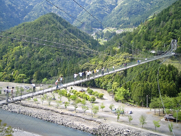 長さ297メートル高さ54メートルと、日本有数の大きさを誇る巨大な鉄線の吊り橋が「谷瀬の吊り橋」です。橋の上から眺める十津川の流れはまさに絶景であるうえに、動くたびに揺れるスリルも味わえます。