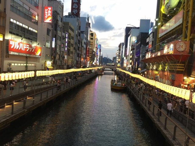 付近ではイベントが開催されることも多いほか、道頓堀川を遊覧できる観光船の船着場もあります。たくさん遊んで歩き疲れたときは、遊歩道から入ることができるカフェや飲食店で一息つきましょう。
