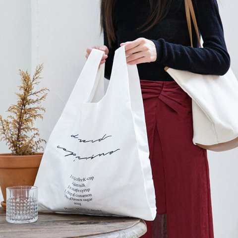 ベーシックなデザインで素朴な印象のある大きめのエコバッグは、いろいろなコーディネートに違和感なく馴染みます。