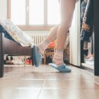 素材にはふかふかなベルベットを使っているので、触り心地がとてもなめらかで気持ちが良いです。また、つま先のVカットが足の形を綺麗に見せてくれます。