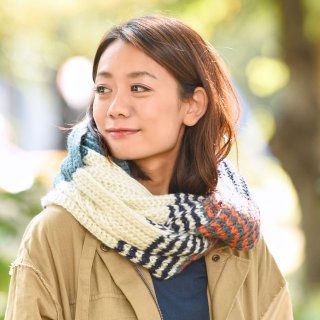 カラーバリエーションは3種類で、ネイビーなどの落ち着いたカラーをベースにオレンジやホワイトといった明るめのカラーがよいアクセントとなっています。個性的なスヌードを探している方におすすめです。