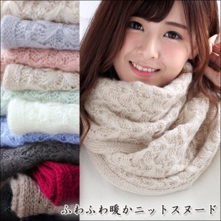 リボンのような模様編みが可愛いニットスヌードです。二重に巻くとかなりボリュームが出るため、寒い日も温かく過ごせます。