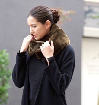 色合いは、ベージュ、ブラウン、ダークグレーの3色です。かなり長めのサイズですが、巻いて使った場合もしっかり全身に馴染みます。リアルファーを使っているとは思えない軽さがよいと評判のスヌードです。