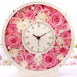 プリザーブドフラワーを使ったラウンド型の花時計です。バラの隙間にホワイトパールが添えられているほか、透明なカバーで花が保護されているので汚れる心配がありません。
