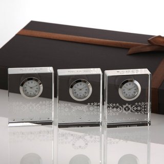 新郎新婦が直筆したありがとうを刻印できる、クリスタルガラス製の三連時計です。おしゃれなラインストーン装飾が入っていて、高級感のある大人の雰囲気が感じられます。