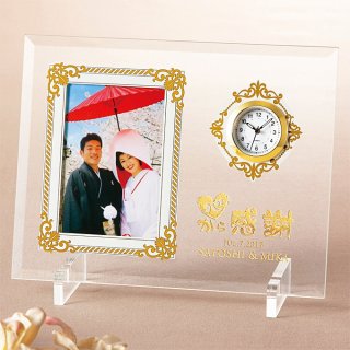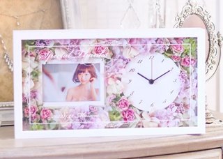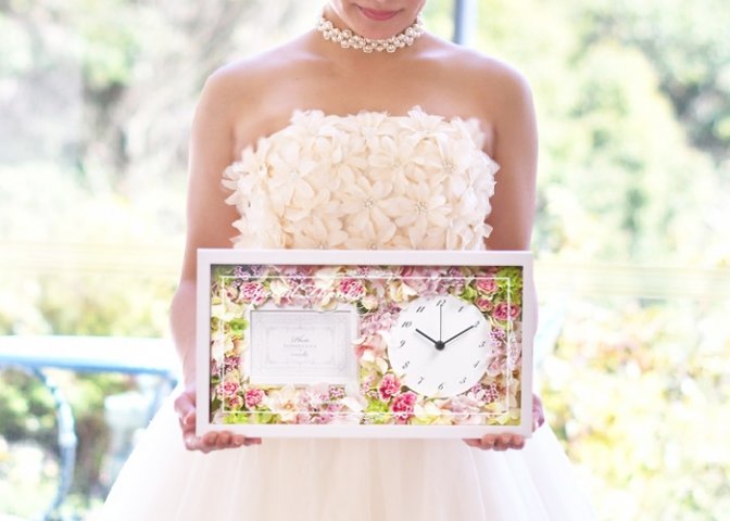 花は全部で9種類あり、時計には日付や名前を入れることも可能です。時計の左には写真を飾れるので、後日結婚式の写真を贈ってもいいですし、前撮り写真を入れても構いません。