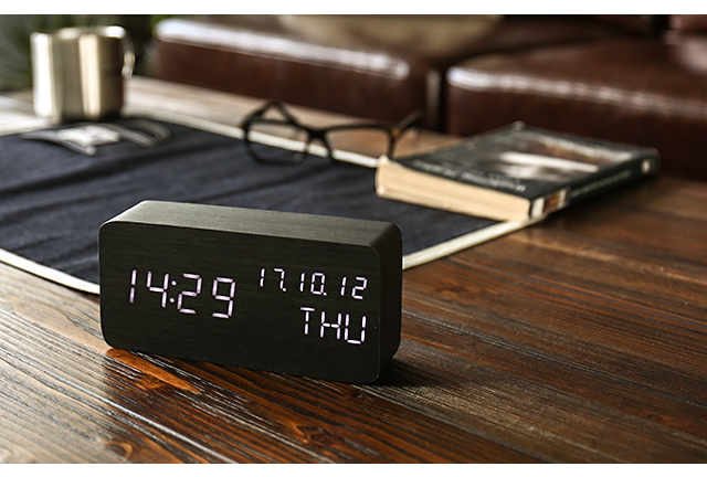 機能面でも充実しており、時間だけでなく、日付と気温が切り替わって表示されます。文字の明るさ調整、5つまでのアラーム設定、音声に反応した点灯表示などの機能があり、使い勝手が抜群です。