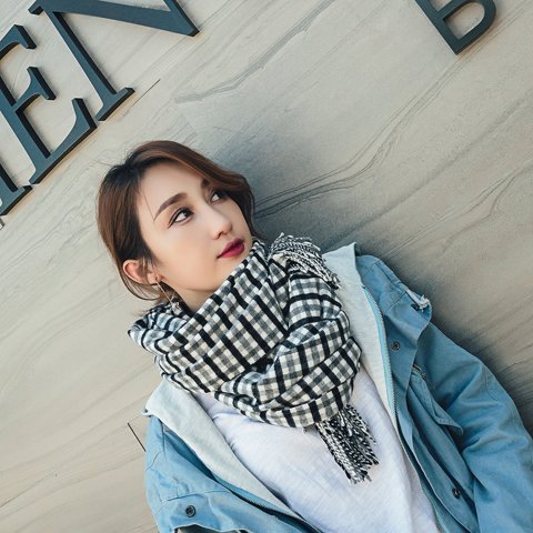 30代女性の上品なファッションに欠かせないジャケットには、チェック柄のレディースマフラーがおすすめです。