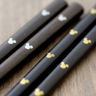 こちらの夫婦箸は、小さな金色と銀色のミッキーのマークが縦に並んでいて、ユニークかつシックなデザインで人気があります。塗の上品で洗練された大人の雰囲気と、ミッキーマークの可愛らしさが融合した逸品です。