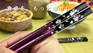 こちらの夫婦箸は、渋さが感じられる漆黒色と大人の女性を彷彿させるような明るめの紫色をしたカラーが目を引くデザインです。どちらにも細かなラメやキラキラの桜の模様が散りばめられていて、食卓を輝かせてくれます。