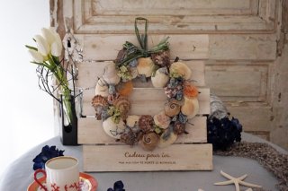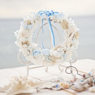 「Souvenirs de la mer d'azur シェルリース」は、ホワイトとブルーを基調にした爽やかな配色が特徴です。このリースもすべてハンドメイドで、ハイクオリティーなリースに仕上がっています。