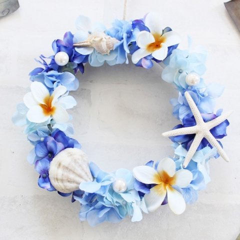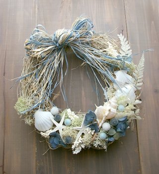 さらに、海を思わせるブルーを基調とした配色もハイセンスで、人気を集めています。また、貝殻だけでなくあじさいのドライブフラワーやラフィアを使用し、アクセントをプラスしているところもポイントです。