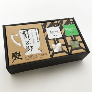 京都にある老舗喫茶店で人気の「龍之介コーヒー」と、口に入れると雪のようにふわっと溶けて、上質な甘さが広がるスノーボールがセットになったギフトです。通常のスノーボールと珍しい抹茶味がセットになっているので、スイーツ好きの方に贈ると喜ばれます。