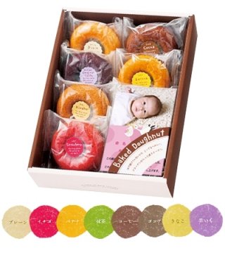 こちらは、見た目がカラフルで楽しい焼ドーナツのギフトです。イチゴやチョコチップなど、すべて味の異なる8個セットで色々な味を楽しむことができ、出産内祝いとして支持を集めています。