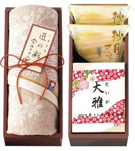 今治タオルと甘さ控えめの菓子詰め合わせは、お菓子をあまりたくさん食べないご家庭や、ご夫婦二人暮らしの方などにぴったりのギフトです。こちらの商品は、お菓子のボックスに和柄の名入れラベルが付きます。