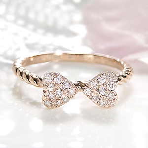 ぷっくりとしたハート部分が華やかなこちらのリングは、ハートが向かい合ってリボンの形を成しているのが特徴です。絆を結ぶラッキーアイテムであるリボンがハートでデザインされたリングは、とっておきの贈り物として多く選ばれています。