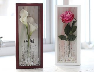 アクリル板にすることで両面から光が射し込むため、より美しく見えると人気を集めています。使用される花はシルクフラワーで、バラやガーベラなど5種類から選ぶことができます。