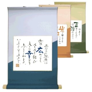 掛け軸のフレームは黄土色・うぐいす色・藍色の3種類で、すべて落ち着いたツートンカラーで作られています。流れるような書体の文字は、名前の部分だけフレームカラーと同じ色が使われます。