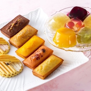 こちらのギフトセットでは、6種のフルーツゼリーと5種のフィナンシェ、そしてヴァッフェル(波型クッキー)と、バラエティ豊かな味わいを楽しむことができます。特に果肉がごろごろと入ったゼリーは見た目も味も申し分なく、フルーツ好きの方にも納得してもらえるひと品です。