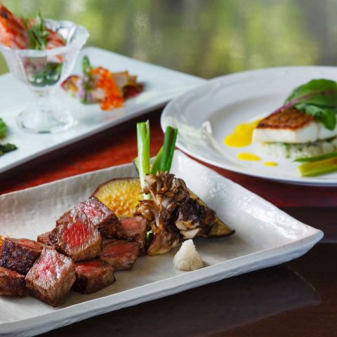 お庭に面したスタイリッシュで開放的な空間で、シェフが腕を振るう肉料理や魚料理などを楽しめます。