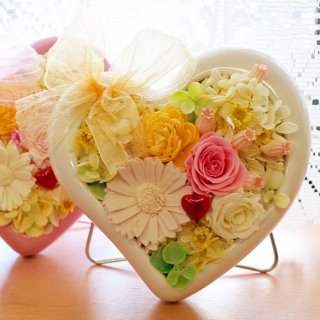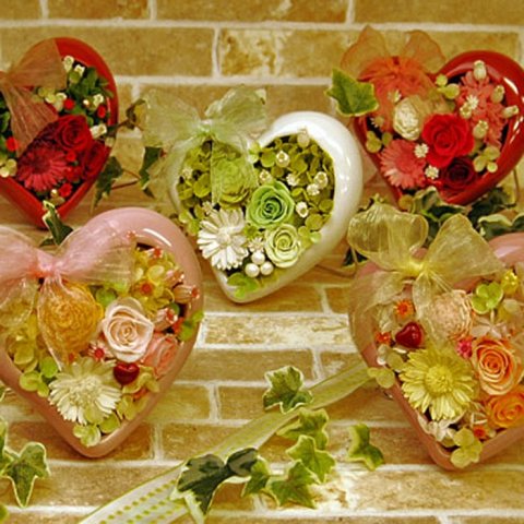 バラのプリザーブドフラワーを中心に据えたハート型の陶器のアレンジメントは、丸みを帯びたシルエットが可愛らしいアイテムです。ピンクやレッド、グリーンなど個性を放つ多種多様なカラーが揃っています。