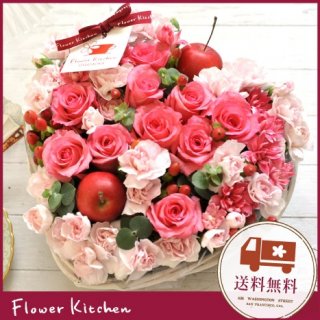 「ハートケーキ アレンジメント」は、結婚祝いだからこそ贈りたいおしゃれなプレゼントです。カーネーションやヒペリカム、林檎などの変化に富んだモチーフが、10本のバラの花を美しく引き立てます。