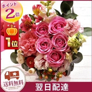 「選べるバラのアレンジブーケ」は、ピンク・レッド・オレンジ・ミックスなどから、好みのカラーを選べる点が大きな魅力です。華やかな色のバラをメインとしたブーケが揃い、その場の雰囲気をぱっと明るくしてくれます。