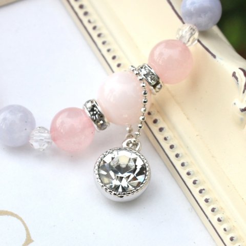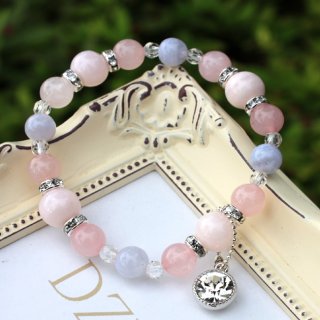 このブレスレットはピンク系の色で統一されたデザインで、女性らしさを引き立ててくれます。使われているピンクオパールやローズクォーツは恋愛成就や開運の効果があるとされているので、お守りとしても人気です。