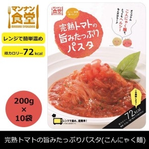 マンナン食堂の「完熟トマトの旨みたっぷりパスタ」は、レトルトパックを電子レンジや湯煎で温めるだけで食べられる手軽さが便利です。トマトの旨みを活かしており、味わい豊かでありながら72kcalしかない点は、健康維持やダイエットに向いています。