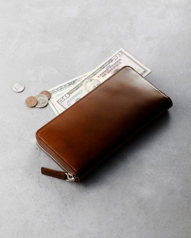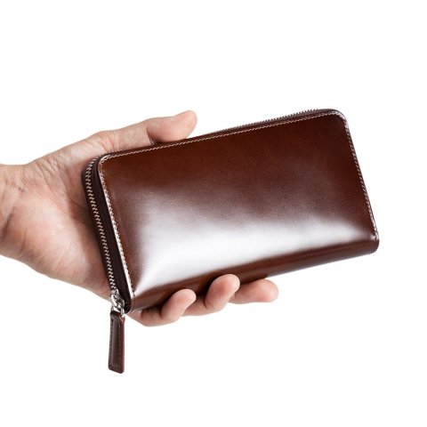 ラウンドファスナータイプで厚みのあるフォルムが特徴ですが、コードバンのしなやかな質感によってスマートな印象を放ちます。